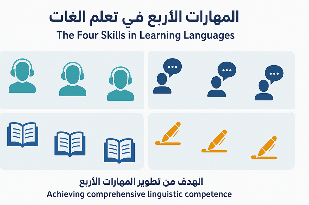 المهارات الأربع في تعلّم اللغات هي الأساس الذي تُبنى عليه كفاءة الفرد اللغوية، وتُعد حجر الزاوية لأي برنامج أو منهج لغوي ناجح. وهي: أول مهارة تُكتسب عند تعلم أي لغة، وتركّز على فهم اللغة المنطوقة والتفاعل معها. تشمل: فهم الكلمات والتراكيب عند سماعها تمييز النبرة والإيقاع والوقفات الصوتية التقاط المعنى والسياق العام من الكلام مثال تدريبات: تمكن المتعلم من التعبير عن أفكاره وآرائه شفهياً بطلاقة وثقة. تشمل: نطق صحيح وواضح تكوين جمل سليمة لغويًا استخدام المفردات المناسبة للموقف مهارات الحوار والإقناع مثال تدريبات: بناء القدرة على فهم النصوص المكتوبة واستخلاص المعاني منها. تشمل: قراءة مفردات وتراكيب جديدة فهم الأفكار الرئيسية والفرعية تحليل النصوص وربط المعاني تنمية التفكير النقدي مثال تدريبات: إتقان صياغة الأفكار على الورق أو بالحاسوب بشكل واضح وصحيح. تشمل: تشكيل الجمل والفقرات استخدام القواعد والإملاء السليم تنويع الأساليب التعبيرية كتابة رسائل وتقارير وملخصات مثال تدريبات: تحقيق كفاءة لغوية شاملة تسمح للمتعلم بـ: التواصل الفعّال الفهم والتحليل التعبير الواضح تطوير التفكير والنطق السليم✅ 1. مهارة الاستماع (Listening)